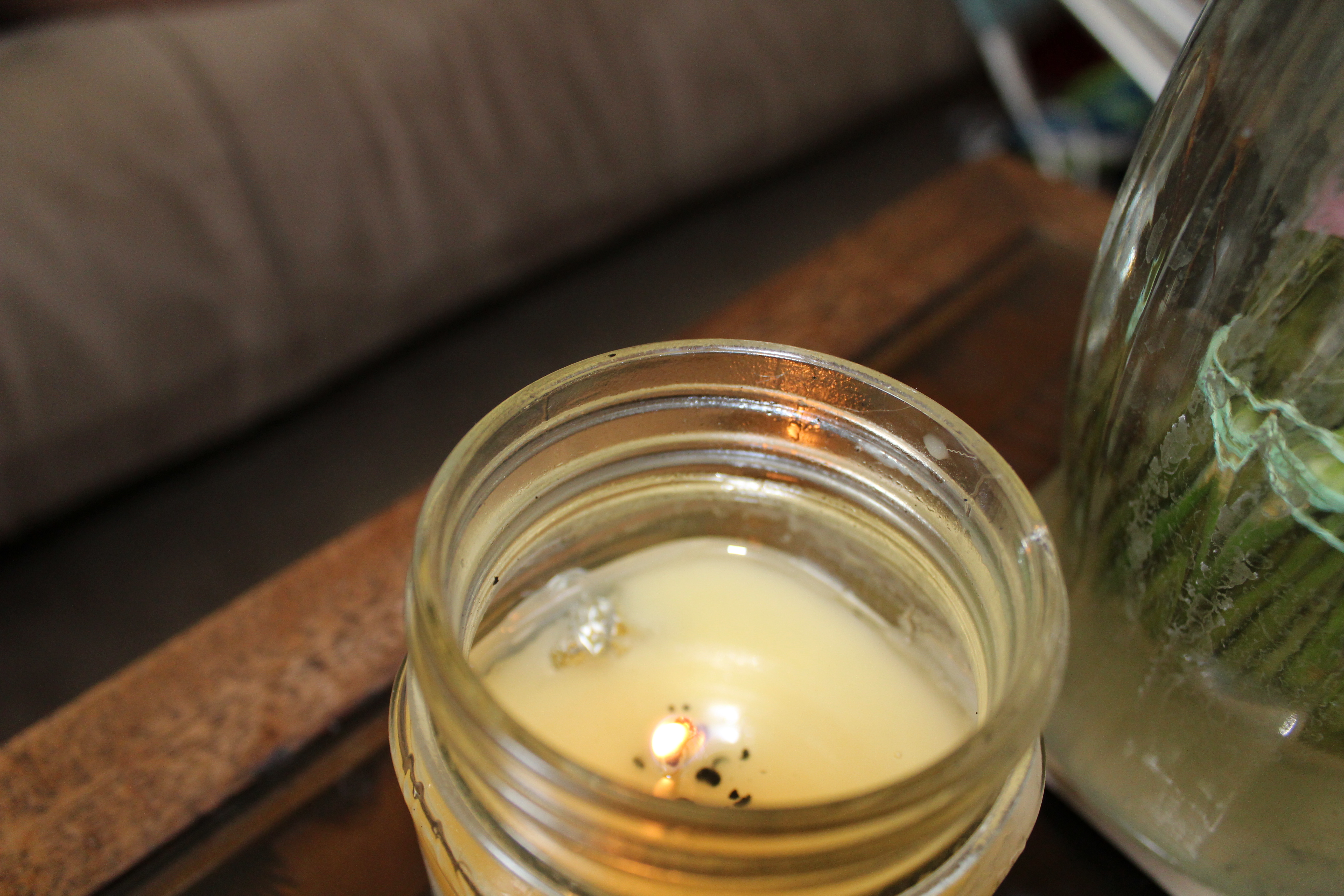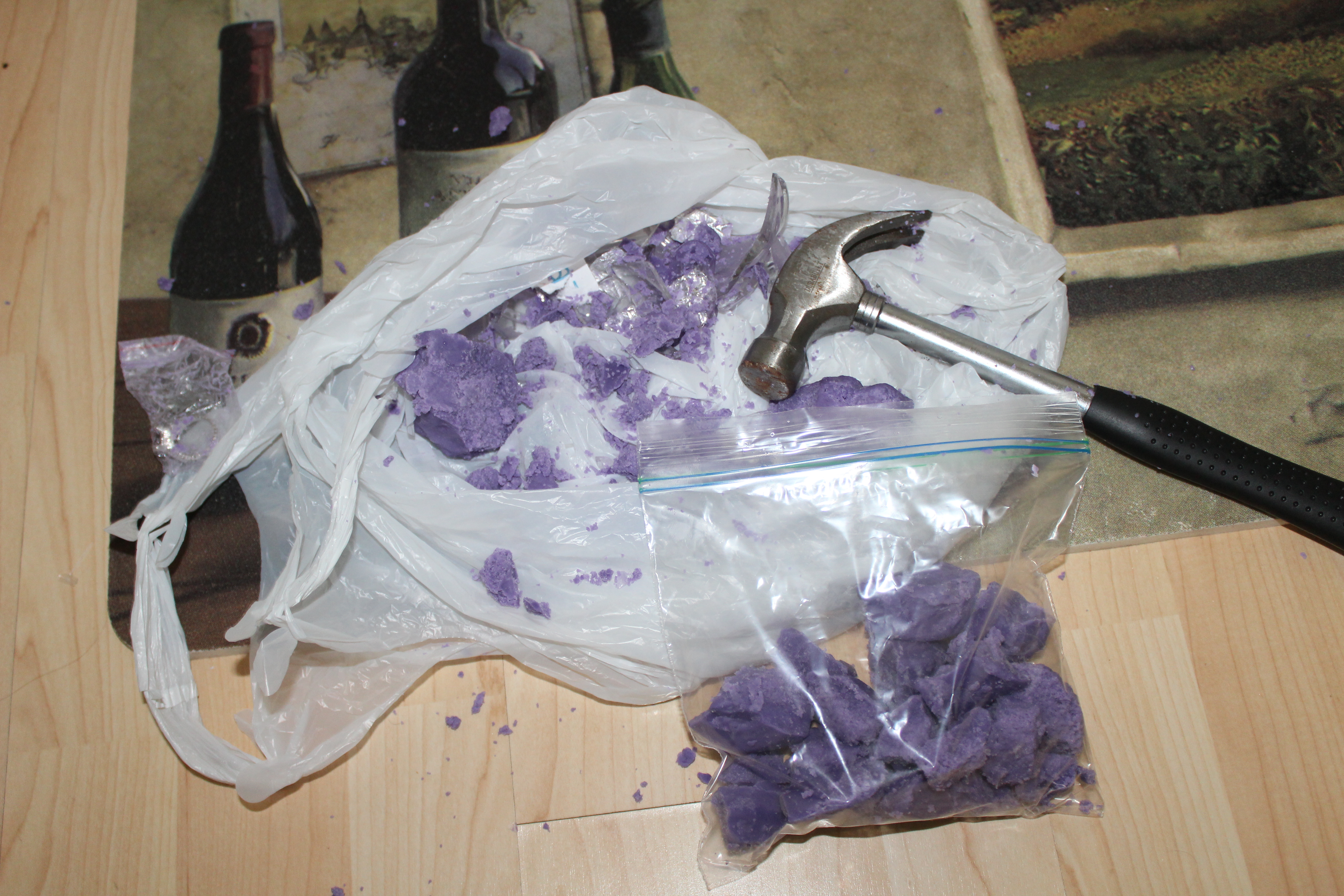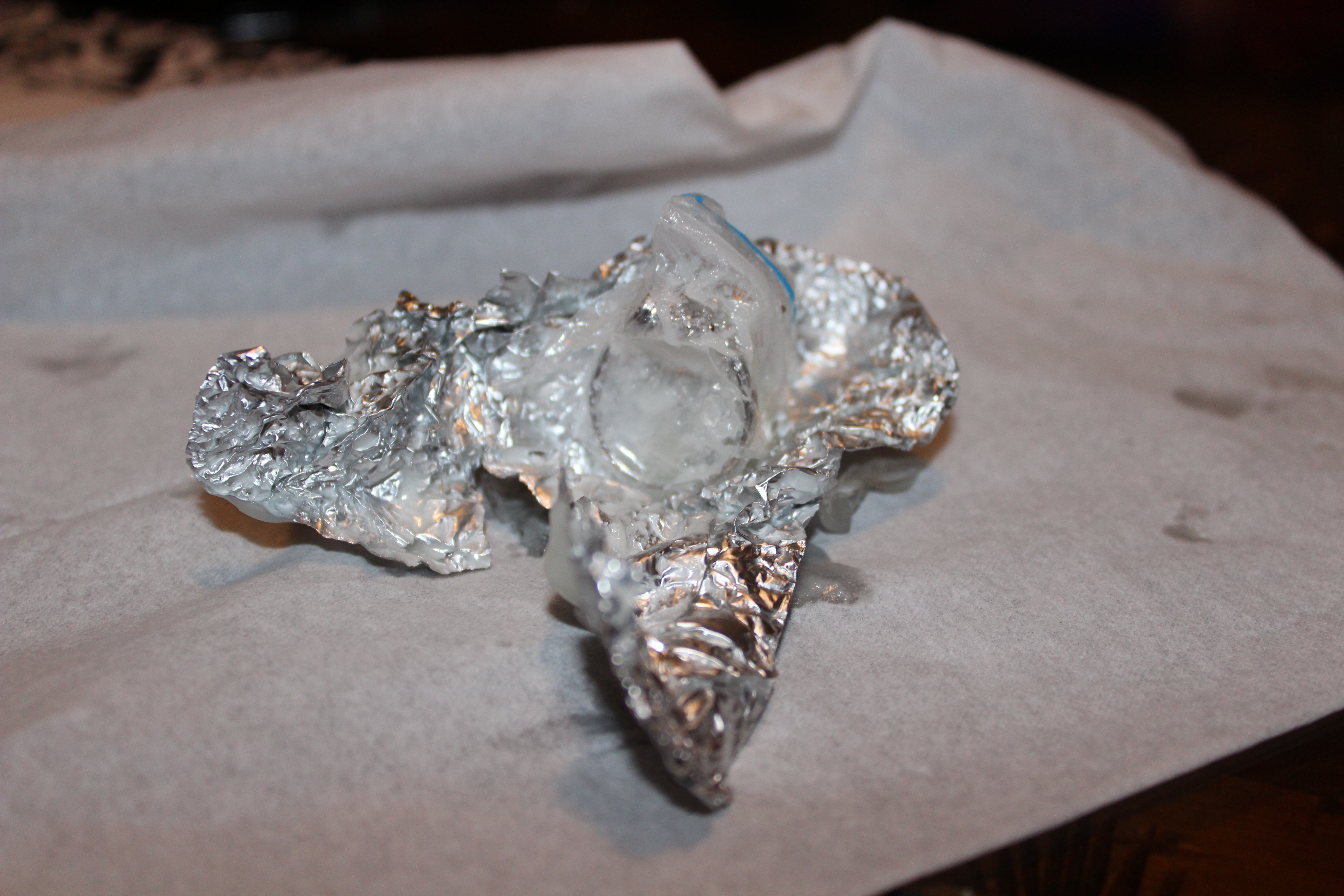 I wrapped the candle in a plastic bag and hit the jar with a few light slams of the hammer to safely break the glass free from the candle. Then, I used the other side of the hammer to break the candle up in chunks and put them in the freezer for a couple of hours to harden.