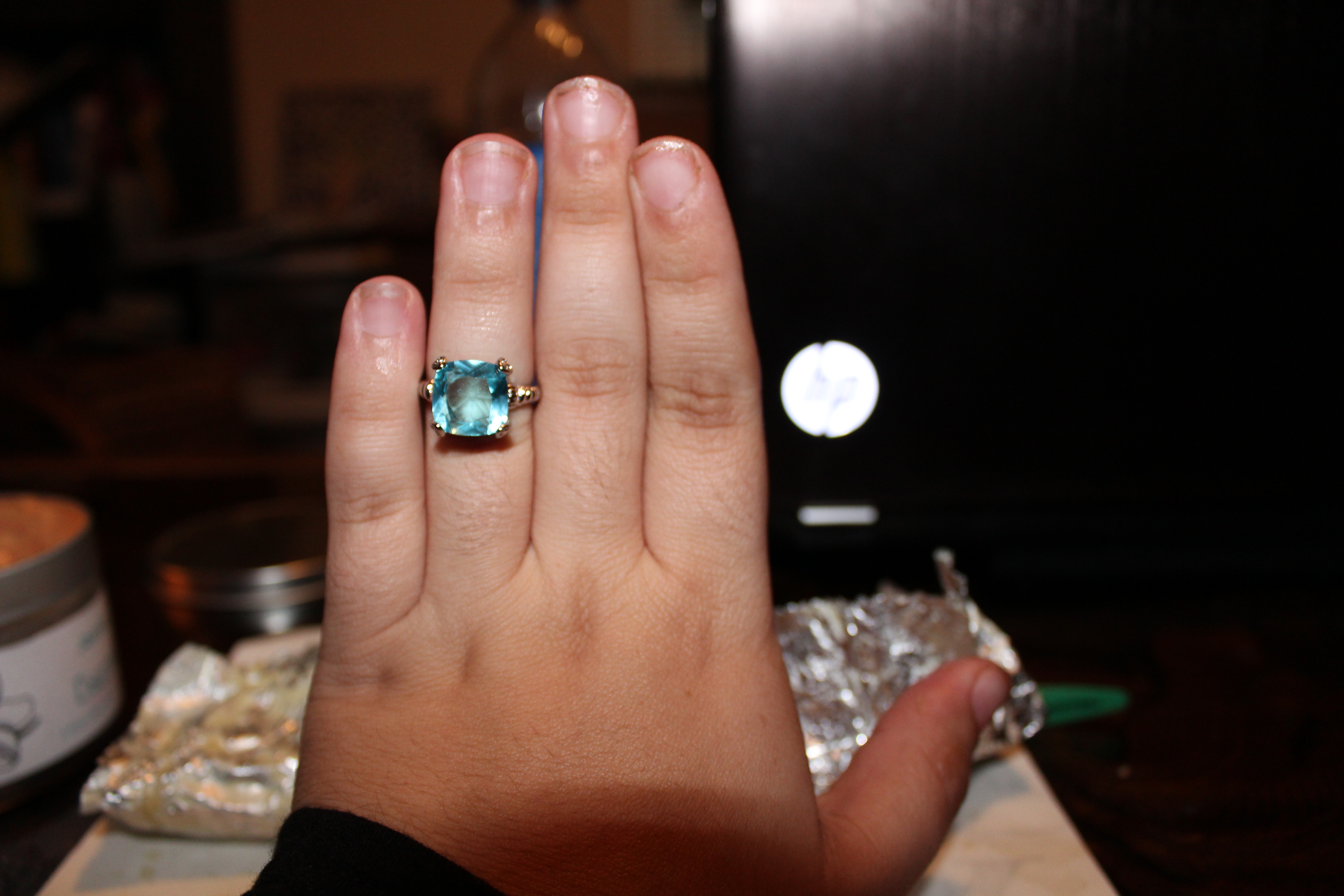 Ta-da! It was the same ring as the first ring, just in blue. This was actually size 9 as well but it was so waxy, I had to wash it before I wore it. Now my sister and I have matching ones.